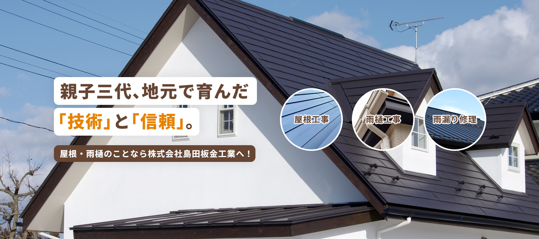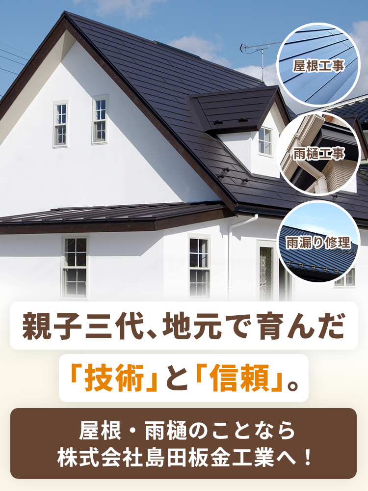 埼玉県入間郡越生町の株式会社島田板金工業では、主に板金屋根(金属屋根)の屋根工事・雨樋工事に対応。雨漏り修理といった、緊急性の高い施工にも対応可能です。